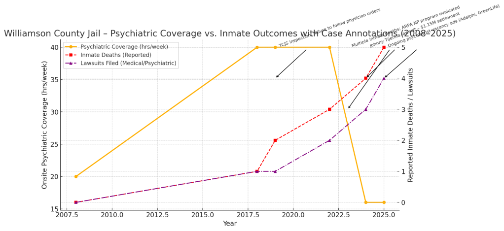 Here’s the enhanced timeline showing how Williamson County Jail’s medical and psychiatric staffing evolved — now annotated with inspection and compliance events.